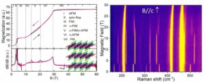 Sous un champ magnétique externe, différentes phases magnétiques avec des cellules magnétiques jusqu’à cinq fois plus grandes que les cellules cristallographiques sont stabilisées (voir Fig. 1 à gauche) et induisent un repliement de zone des modes de phonon. Cela permet de « lire » les états fondamentaux magnétiques en suivant l’évolution des modes de phonon repliés en zone, comme le montre la figure 1 (droite). Ces résultats démontrent le fort couplage entre les configurations de spin non triviales trouvées dans le CrOCl en vrac et les vibrations du réseau, soulignant le rôle des interactions magnéto-élastiques dans les aimants frustrés. Nos résultats élargissent la compréhension du magnétisme 2D, en particulier dans les matériaux où la frustration conduit à des états de spin non conventionnels.