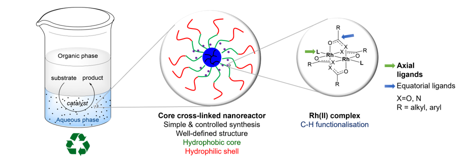 The aim of this project is to apply this methodology to dirhodium(II) C-H functionalisation catalysis with diazo compounds. The performances of dirhodium(II) catalysts are still unchallenged in terms of versatility and efficiency.[3] These complexes bear four bridging (equatorial) ligands and two axial positions able to coordinate ligands and substrates for catalysis. Thus, their incorporation into nanoreactors will be done through binding onto one axial site.[1] The metal-containing nanoreactors will then be evaluated in aqueous biphasic catalysis. This multi-disciplinary internship will enable the candidate to acquire skills in various areas, and will call on several characterisation techniques such as multidimensional NMR, mass spectrometry, dynamic light scattering (DLS), transmission electron microscopy (TEM), etc.