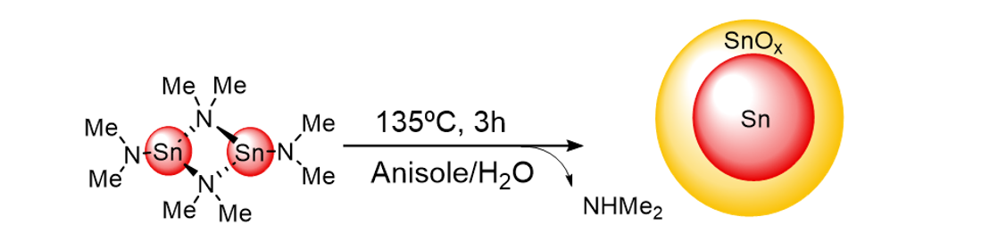 Beyond the typical noble metal-based electrodes (Pt, Pd),[3] alternative electroactive materials relying on abundant metal oxides have been explored. Bulk Tin(IV) oxide (SnO2), in particular, have shown promising catalytic properties when employed in aqueous media: faradaic yields of ca. 75% for N2O reduction and high selectivity against proton reduction.[4] Nanostructuration of SnO2 is therefore a promising pathway to obtain highly active and selective electrocatalysts. Small and well dispersed core-shell Sn@SnO2 nanoparticles can be obtained according to Scheme 1.